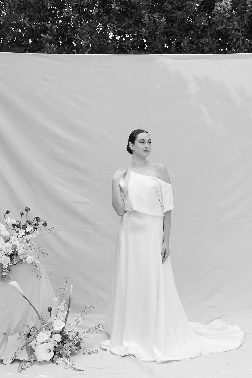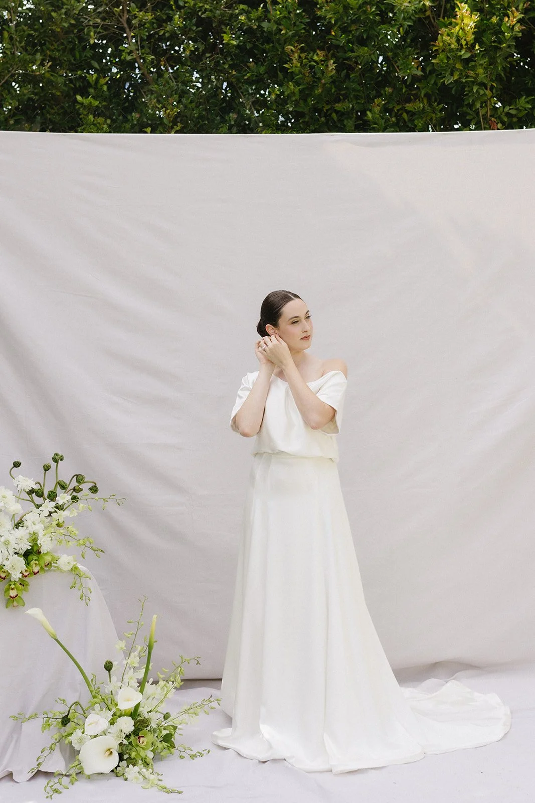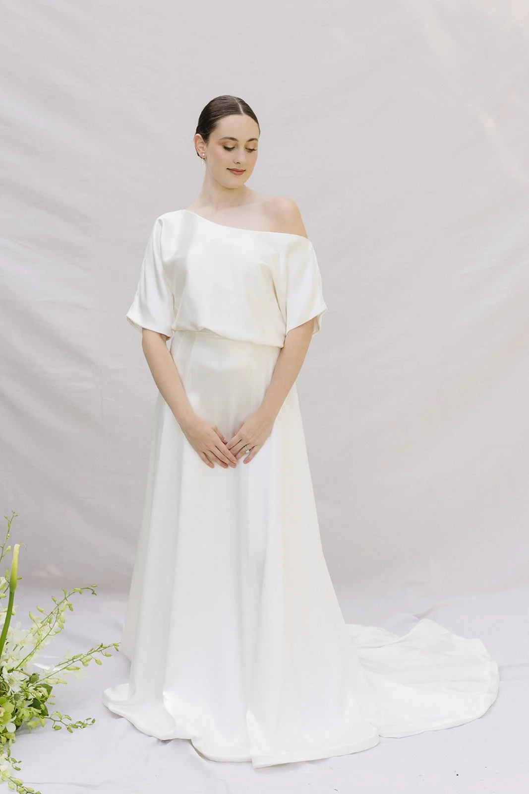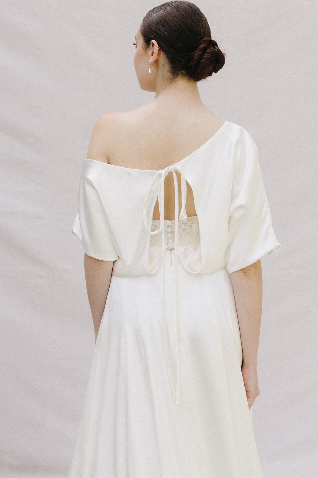 The Amelia blouse has a beautifully draped neckline falling off one shoulder, made from the softest silk crepe satin. The hem of this blouse is gathered to give definition to the waist. There is an organza corset on the inside for structure which is finished with covered buttons at the back and delicate corded lace motifs that are hand sewn on. The lace detailing peekaboos through the key hole opening at the back.
