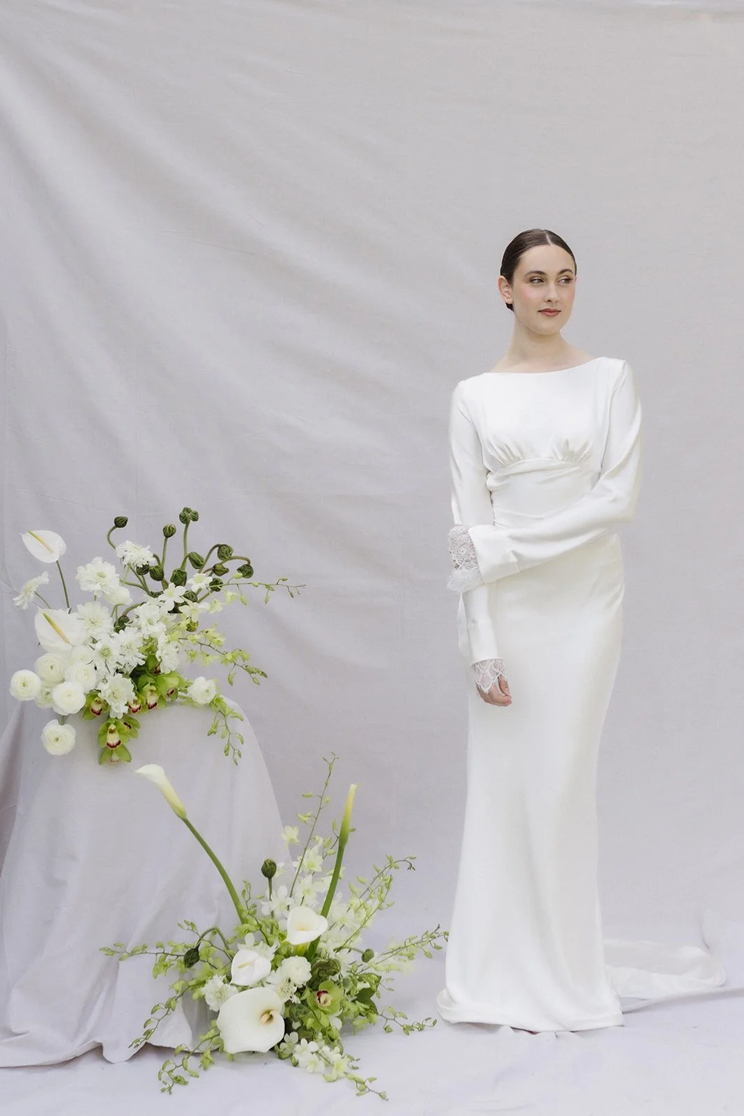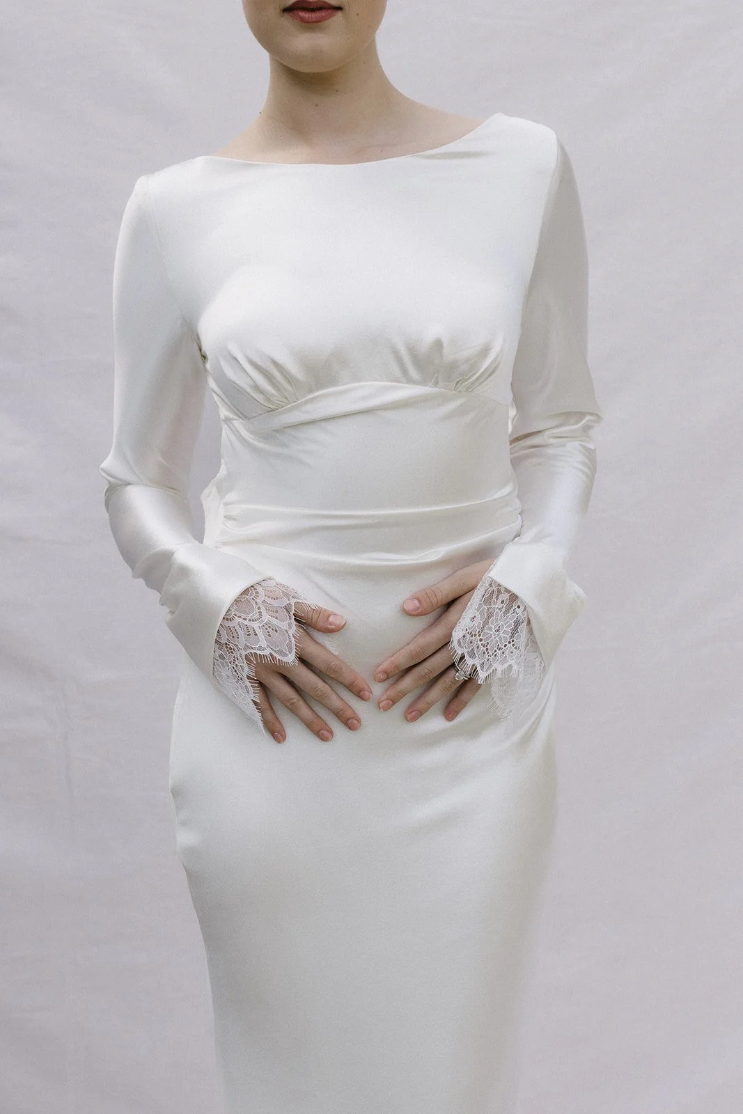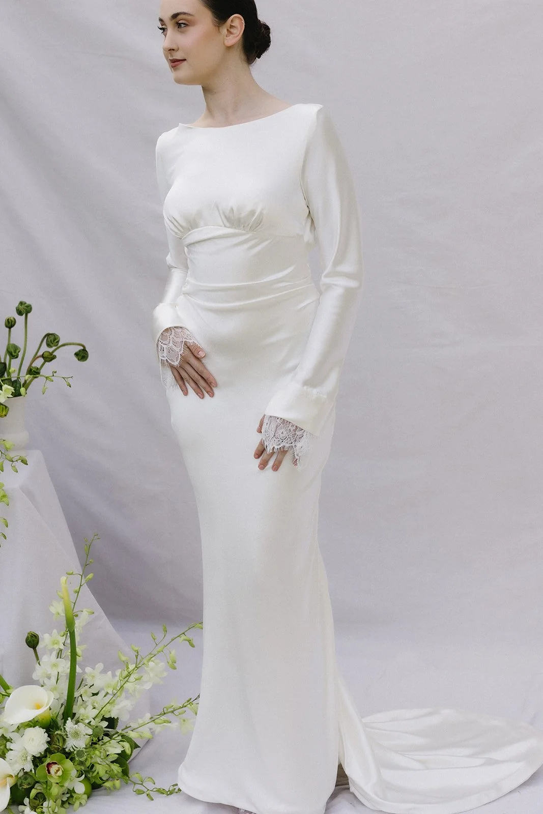 The Maya gown, where every detail has been meticulously thought of. From its figure-hugging silhouette, to the under bust gathers along the curved design line and the draping along the waist, it’s a show stopper! With an open back cowl draping detail, all tied up in a bow at the neck. Maya is a long sleeve gown finished with Chantilly lace cascading over the hands and covered buttons on the cuffs. Made in a buttery soft crepe silk satin the small train follows behind transforming the dress into absolute perfection.