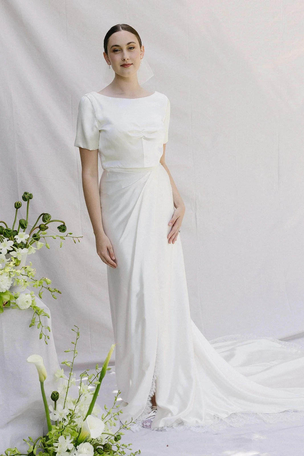 Named after my Nan; the Marlane blouse has a vintage elegant feel, with a boat neckline and gathered bust detailing. Short sleeves and an open back detail with Chantilly lace give it a modern twist.
