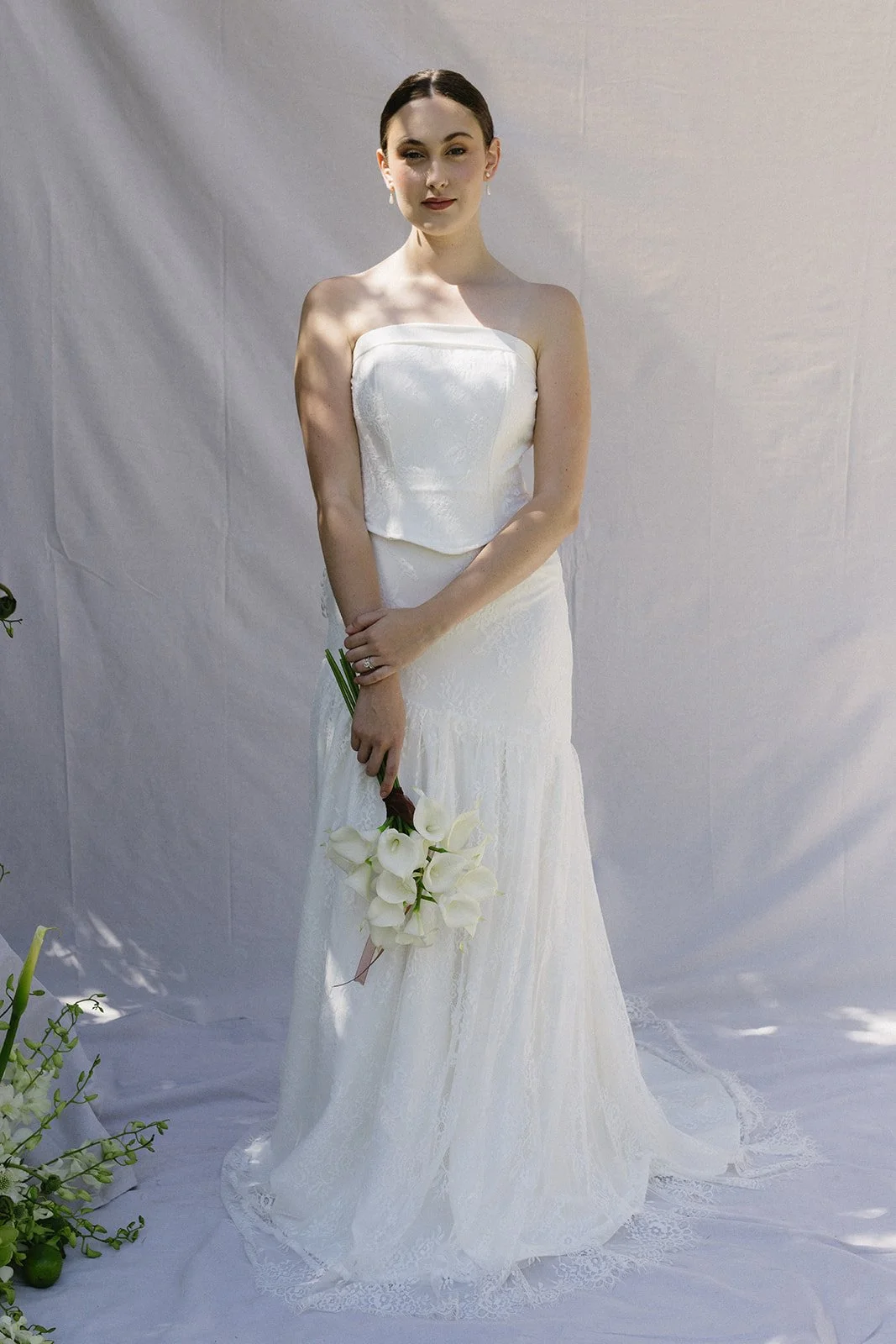 Corset is available to be made in either Silk Taffeta with lace motifs or Stretch Satin covered with Chantilly lace