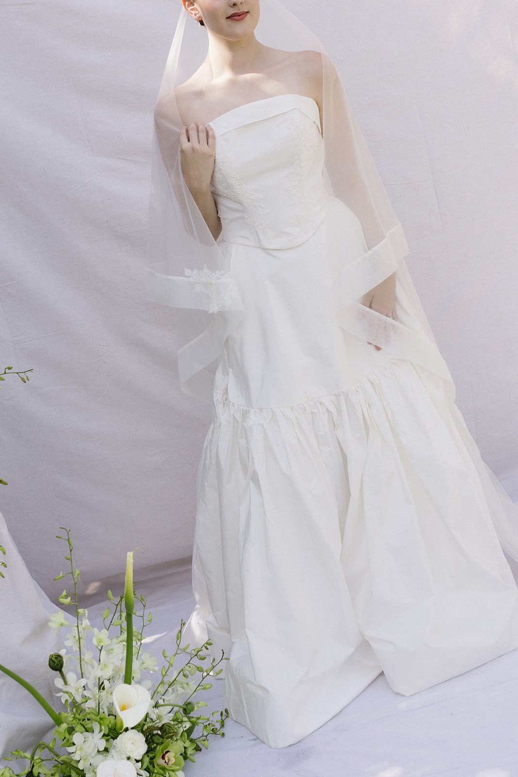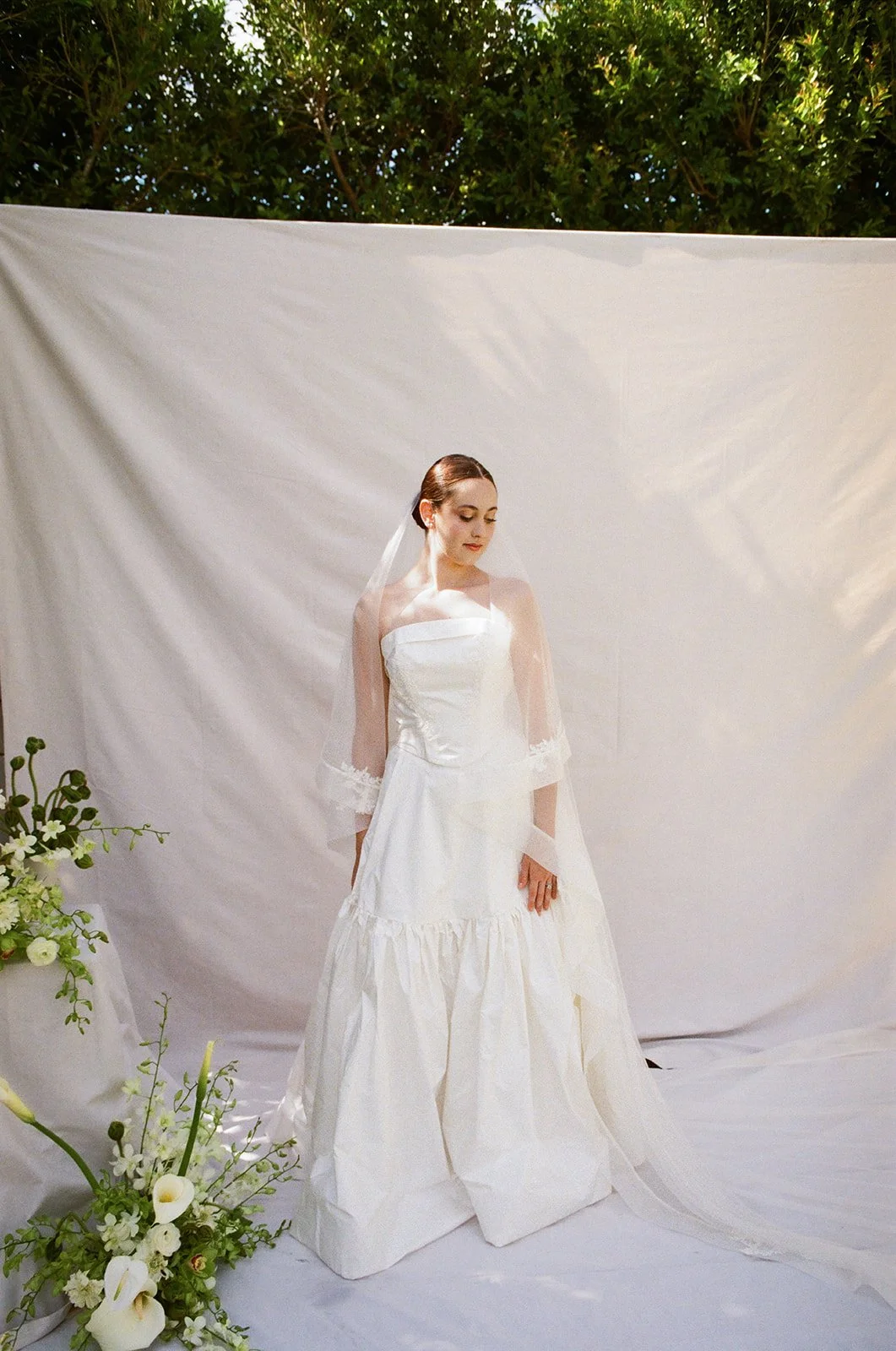 As the name suggests, the Elizabeth Veil is a Royal length veil with face blusher. Made from the softest tulle this veil has been trimmed with a folded Organza border sewn on with French seams. The Organza border gives shape and has a beautifully draped motion when the blusher is worn over the face or pulled back. Corded lace motifs have been hand sewn onto the organza border to give grandeur.