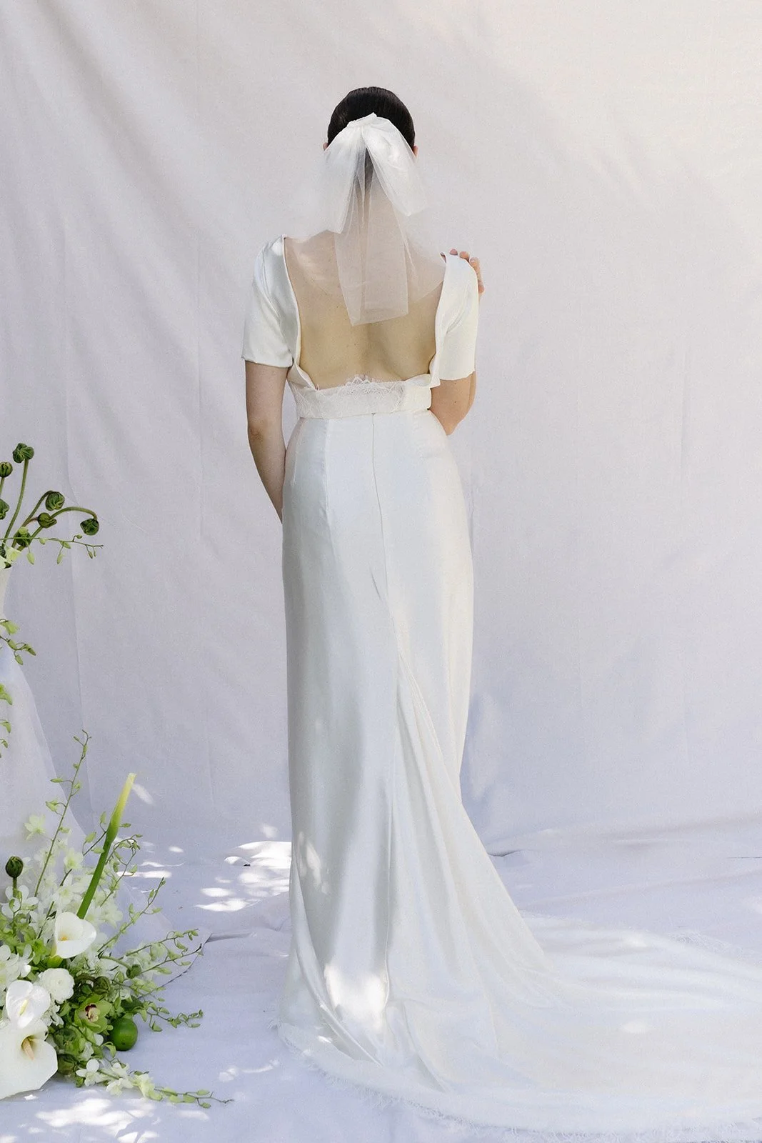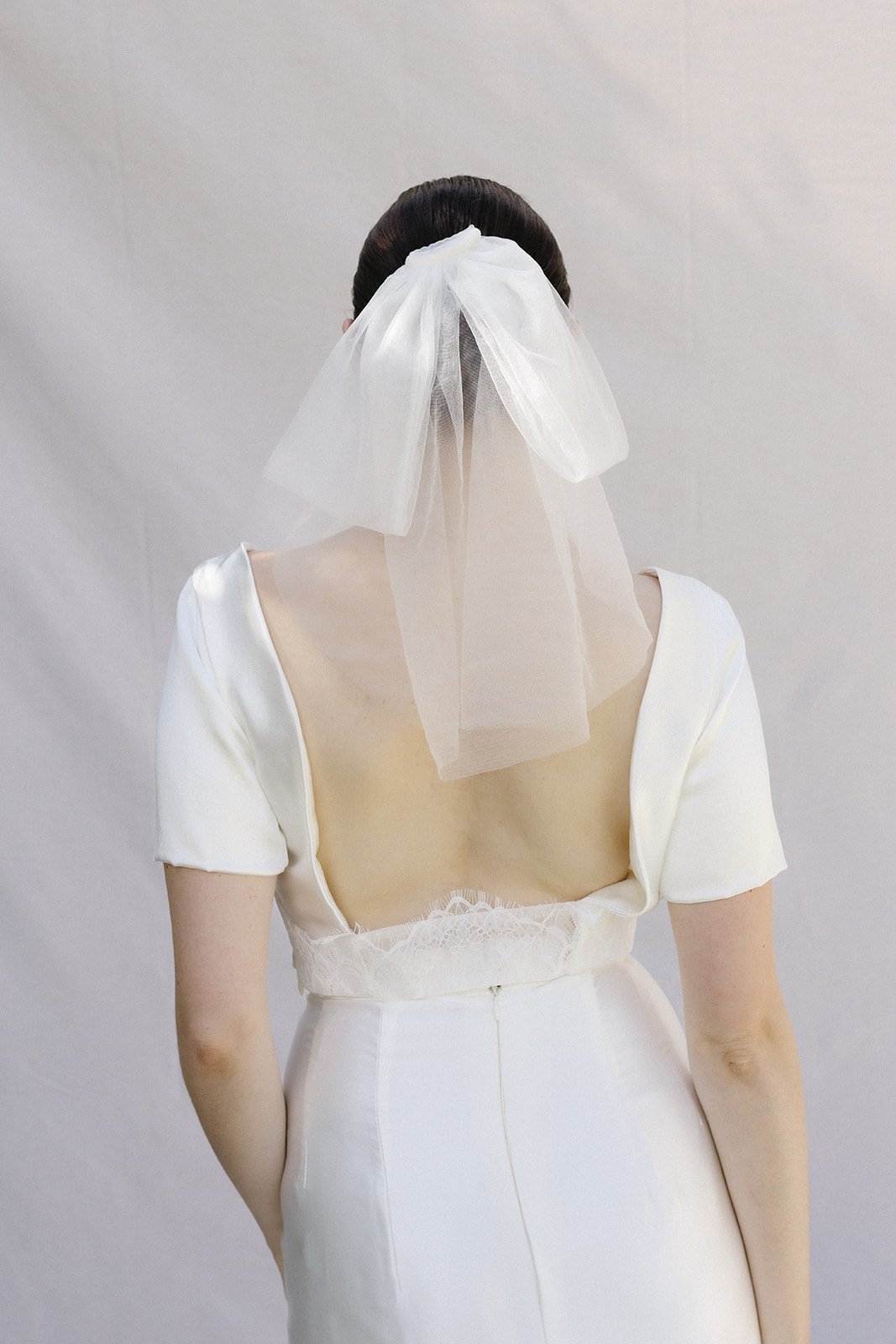 The Jane veil has been crafted from the softest tulle and finished with a delicate bow-like detail. Its mini length has the perfect blend of modern charm and timeless romance. Designed for brides who love a touch of whimsy without losing elegance.